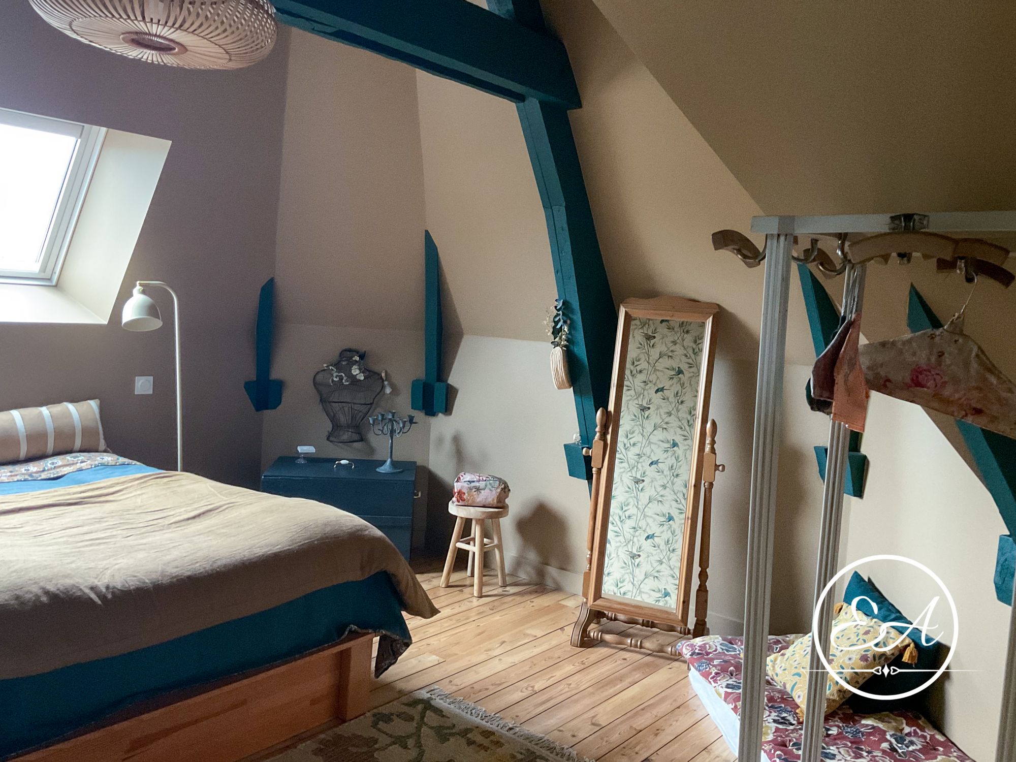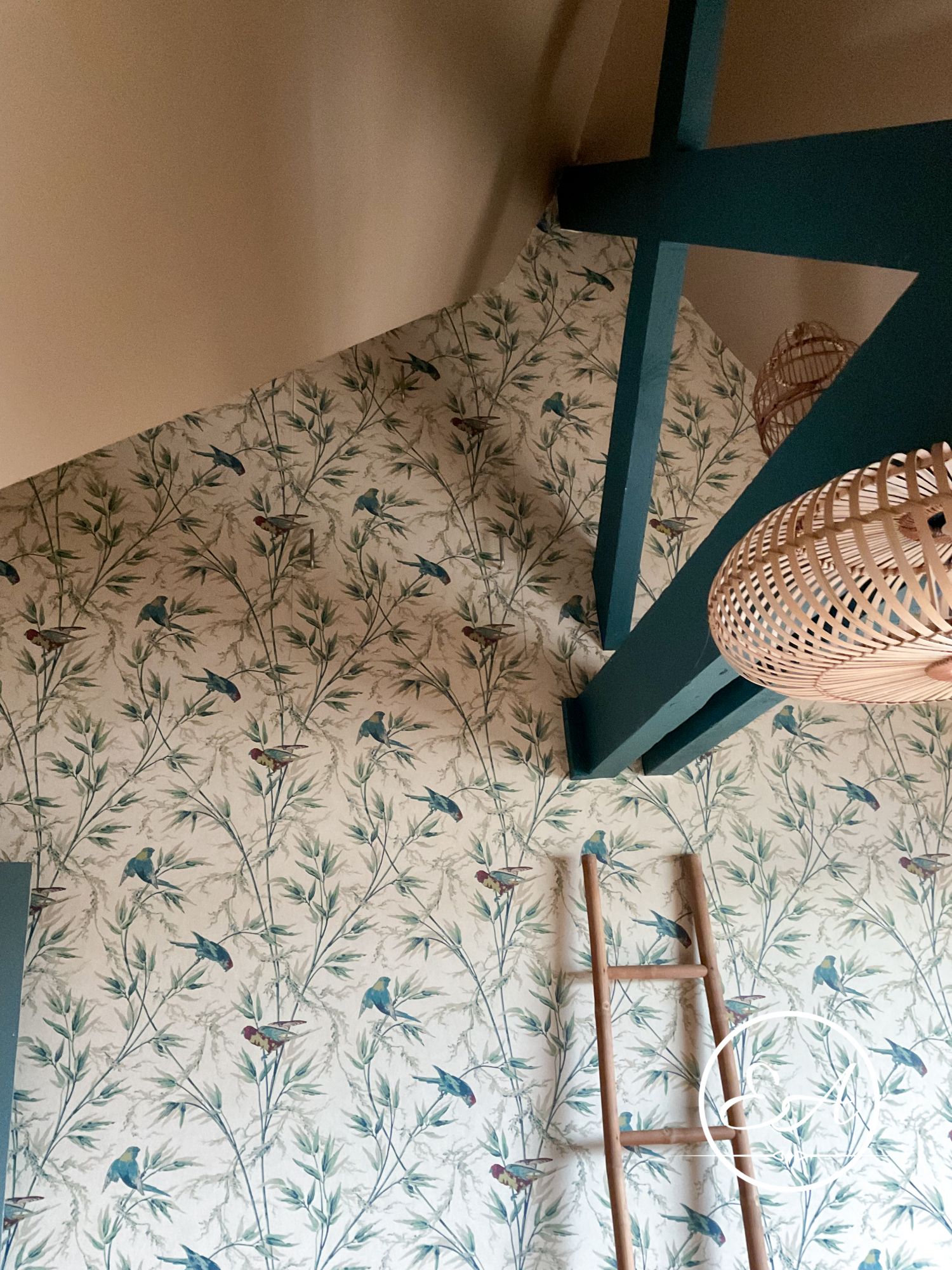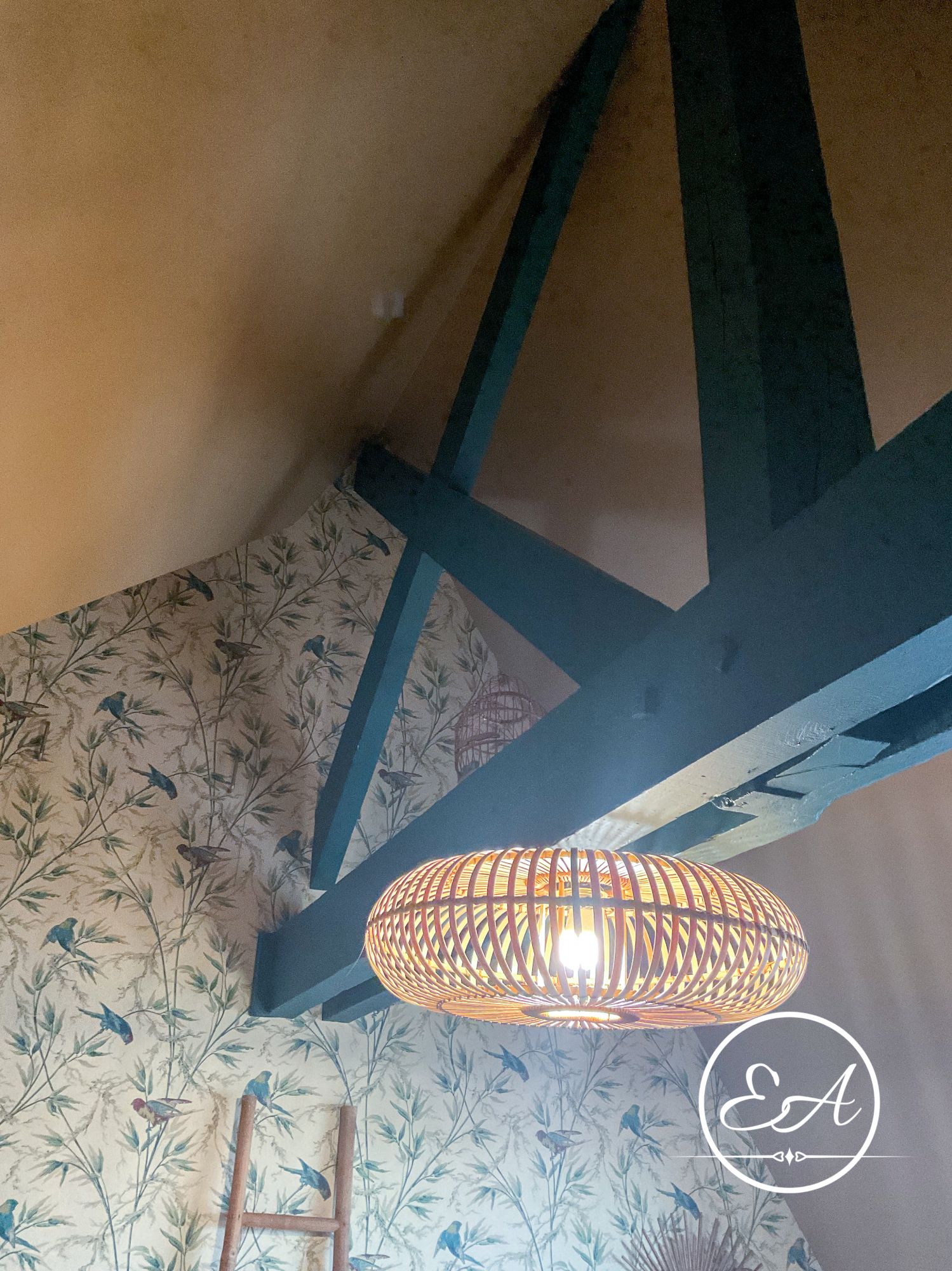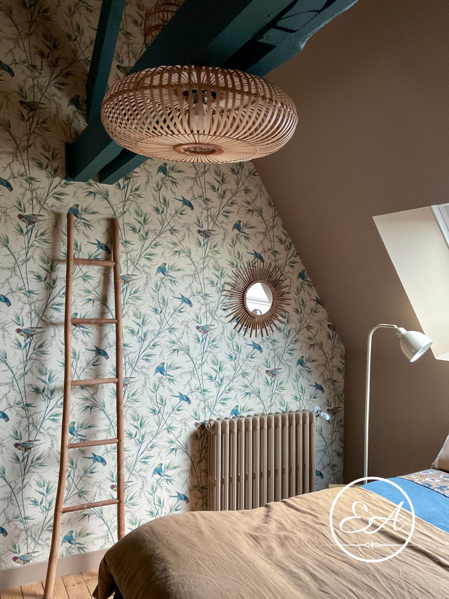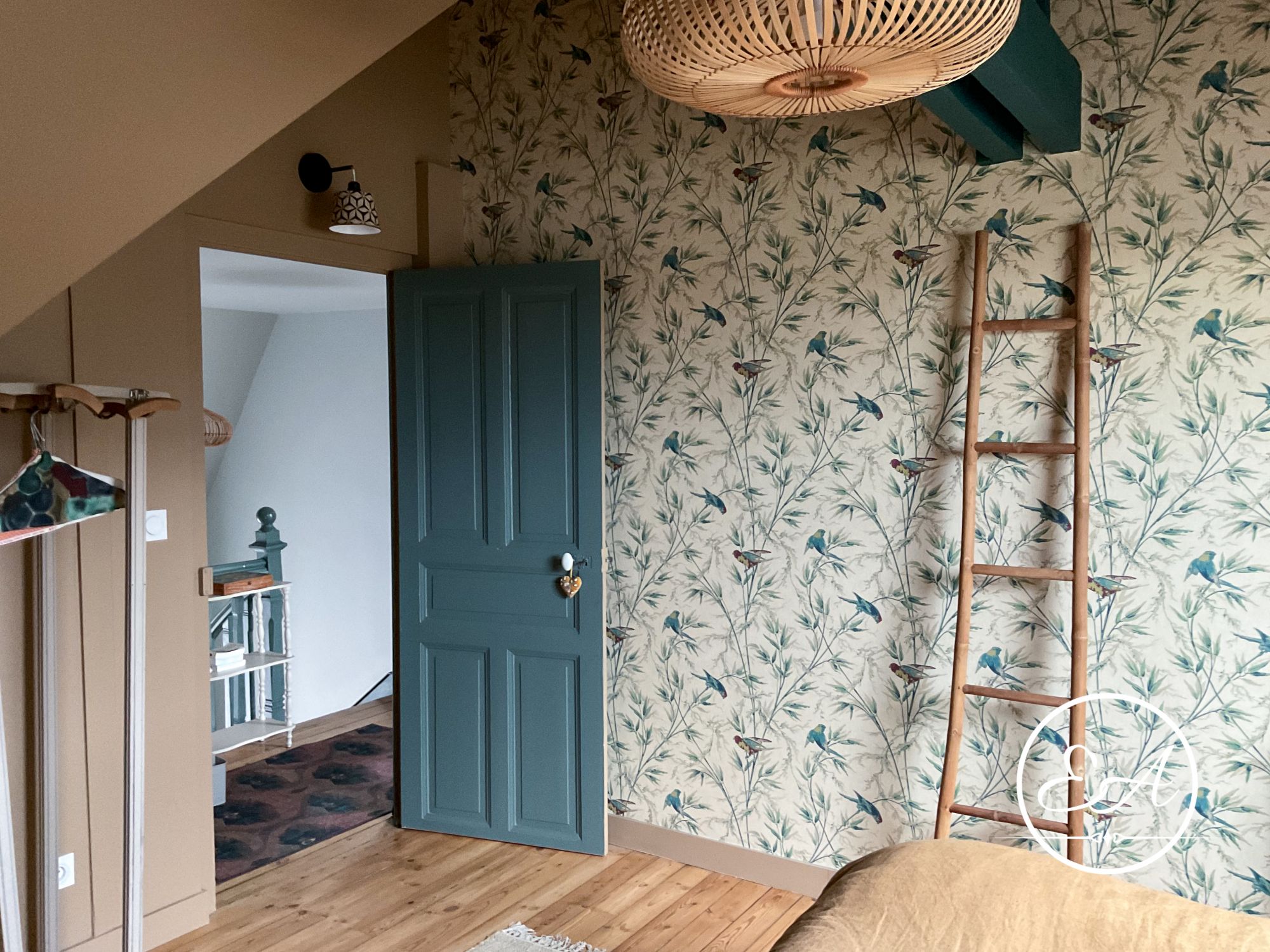 Dans la première chambre, une porte invisible dissimulée dans la paroi donne accès à un espace de stockage sous combles, discret et pratique. L’échelle en bois, posée contre le mur, en est le seul indice, subtile évocation d’un passage secret.