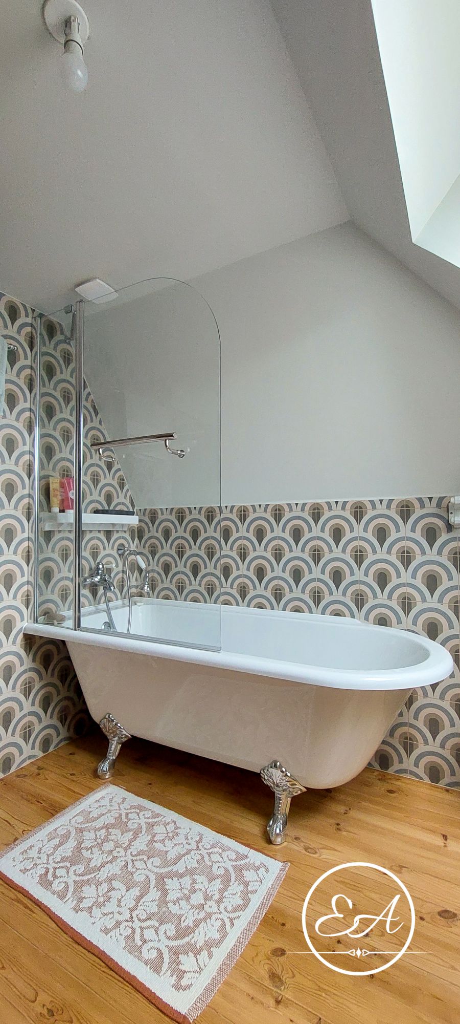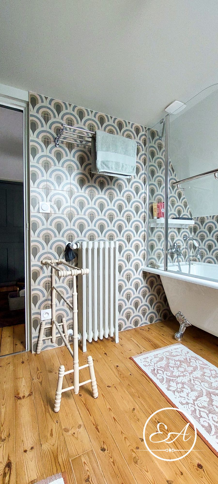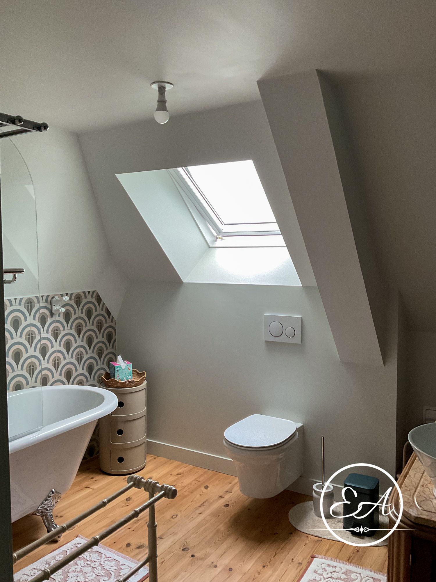 Le projet a nécessité la restructuration du réseau de chauffage à cet étage suite au remplacement de la chaudière, ainsi qu’un réagencement des volumes pour optimiser la circulation et le confort. Une partie des cloisons existantes a été conservée pour préserver la mémoire du lieu, tandis que la salle de bain a été agrandie pour accueillir une baignoire sur pieds et un univers décoratif plein de caractère.
