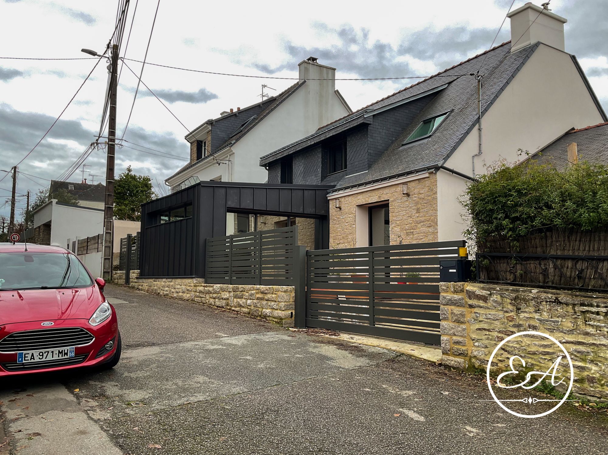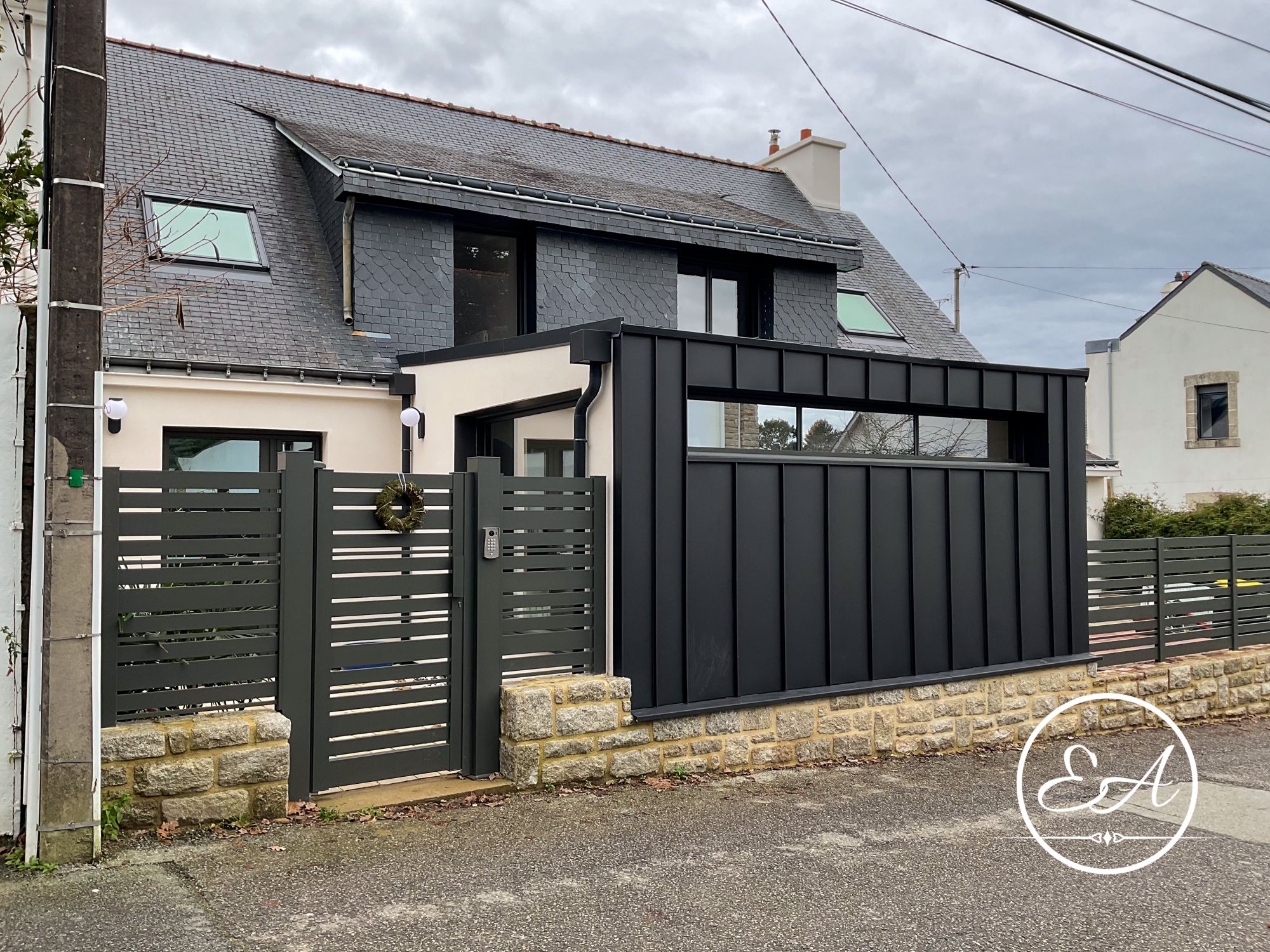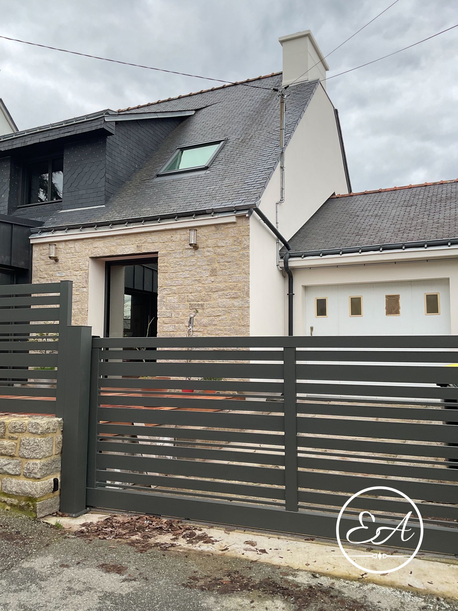 Le portail existant a également été adapté pour coulisser le long du muret en pierre, conservant le caractère du lieu tout en le modernisant et facilitant l'accès au garage depuis la rue étroite.
