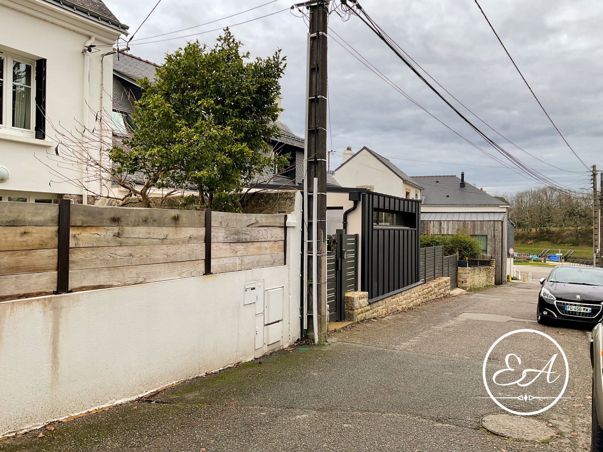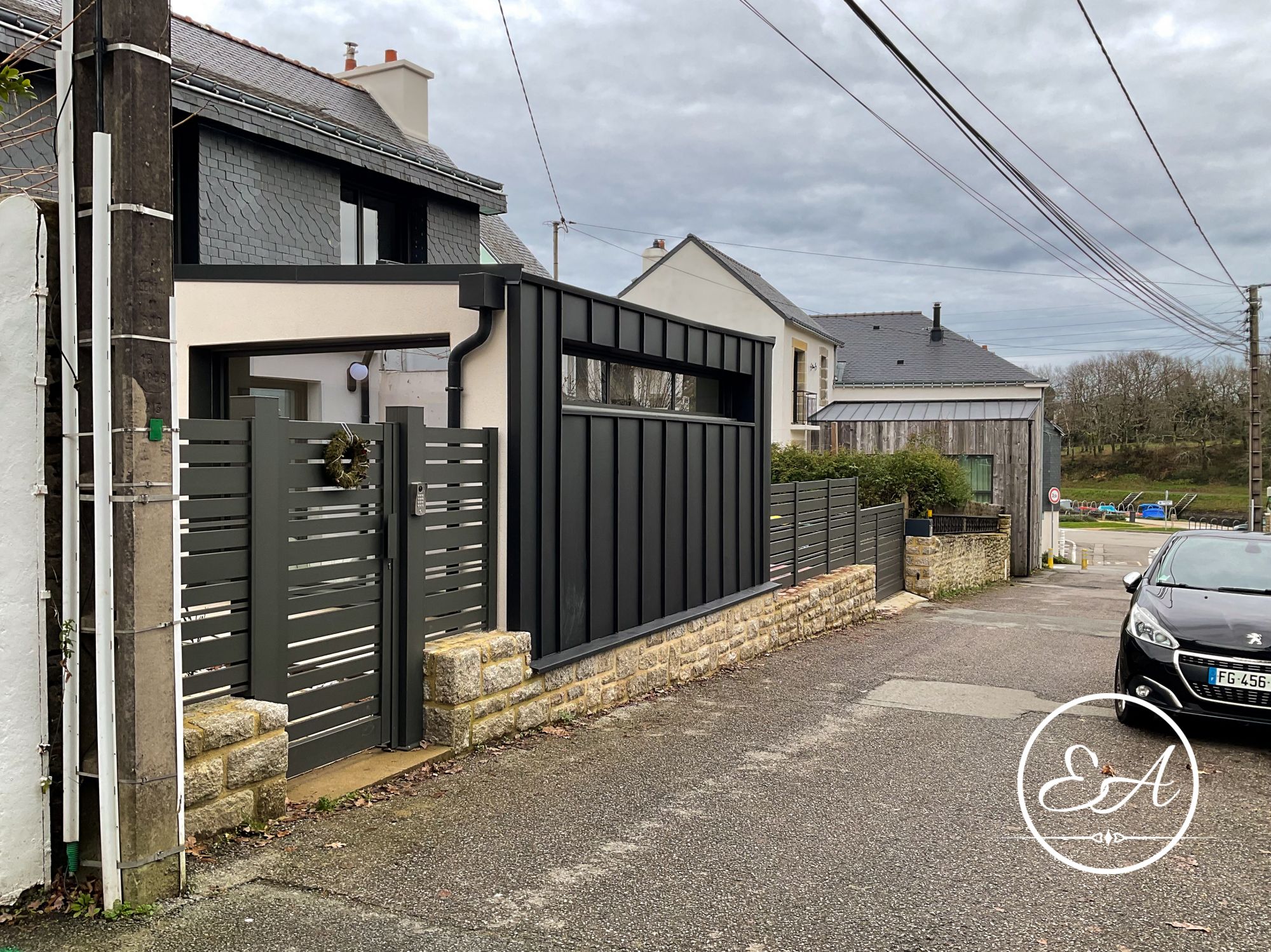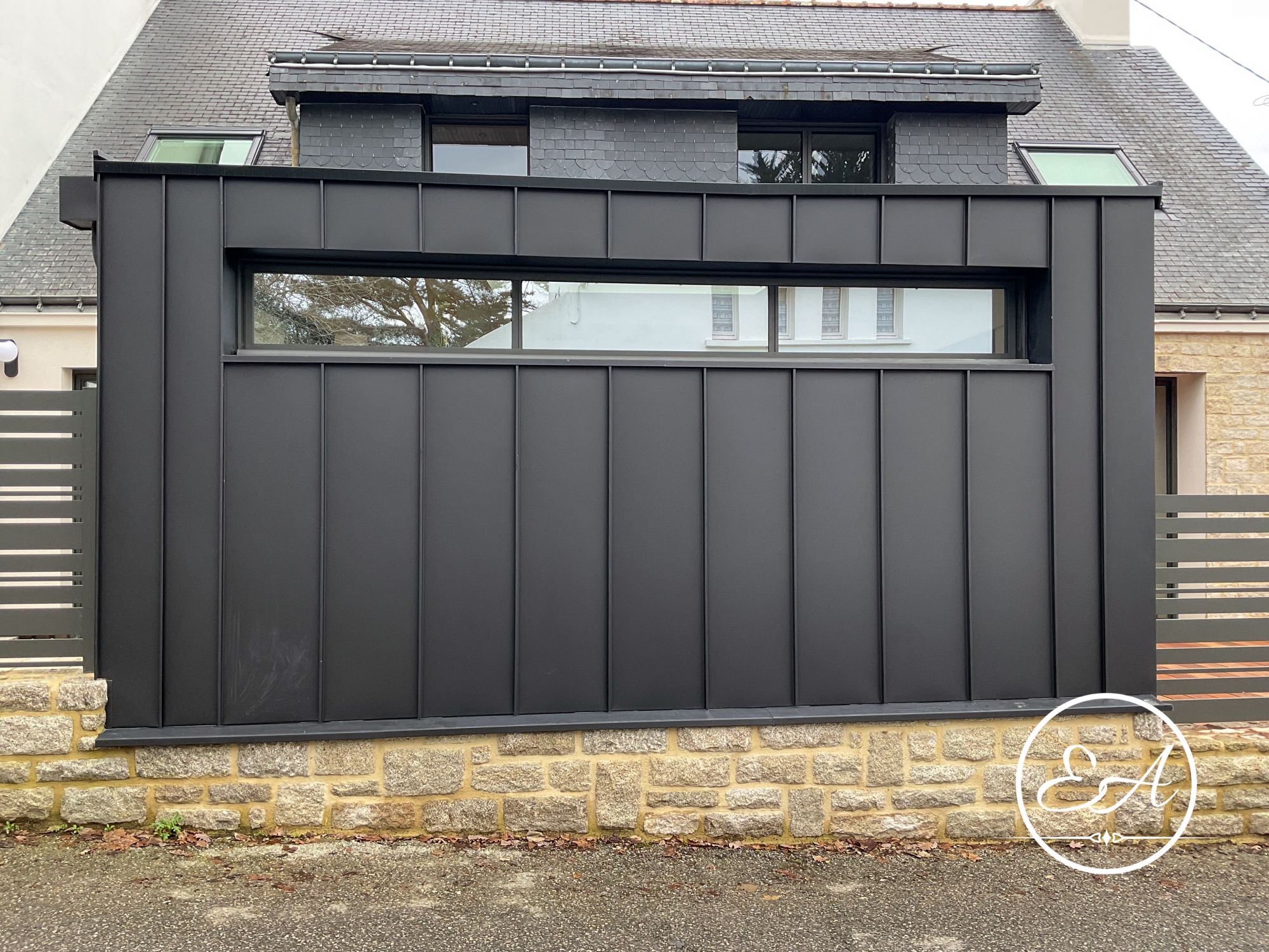 Le portail existant a également été adapté pour coulisser le long du muret en pierre, conservant le caractère du lieu tout en le modernisant et facilitant l'accès au garage depuis la rue étroite.