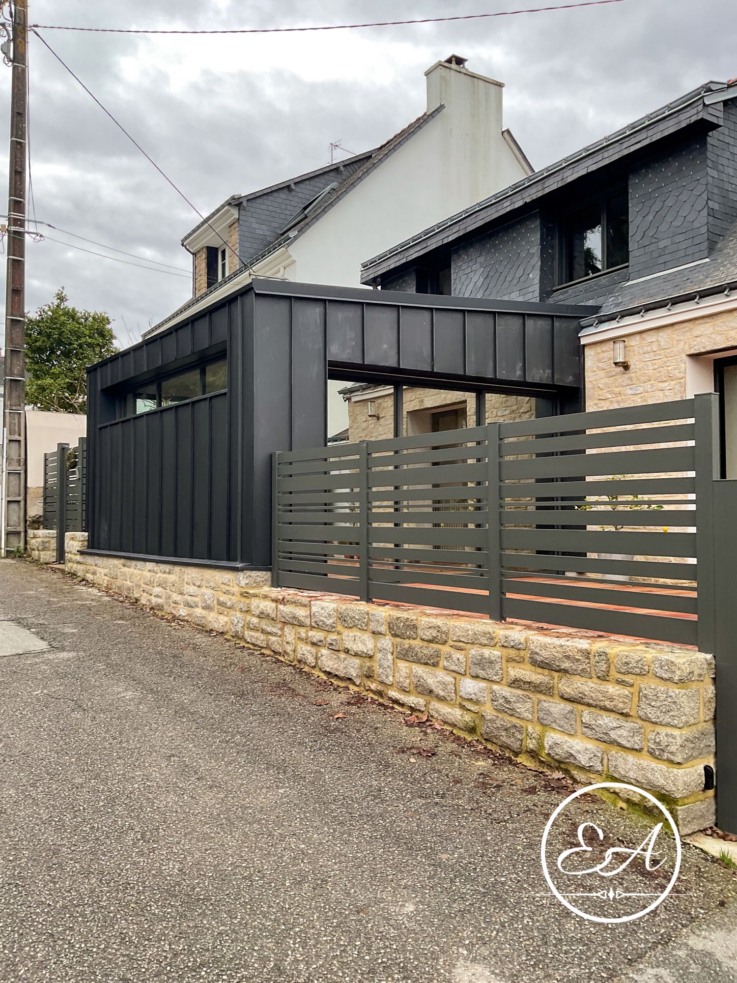 Côté rue, une extension contemporaine à toiture plate, habillée d’un bardage acier, vient affirmer une nouvelle identité architecturale.