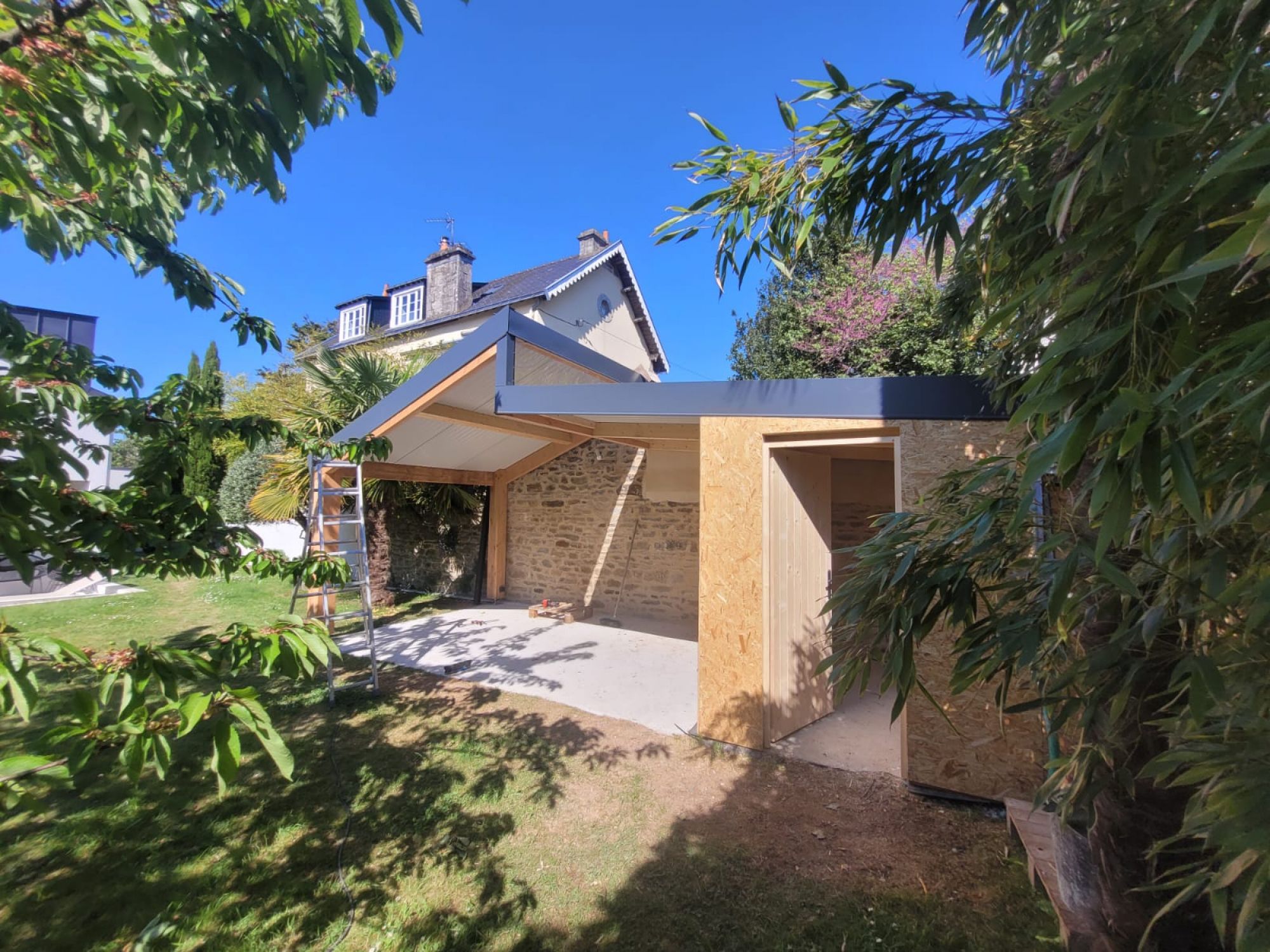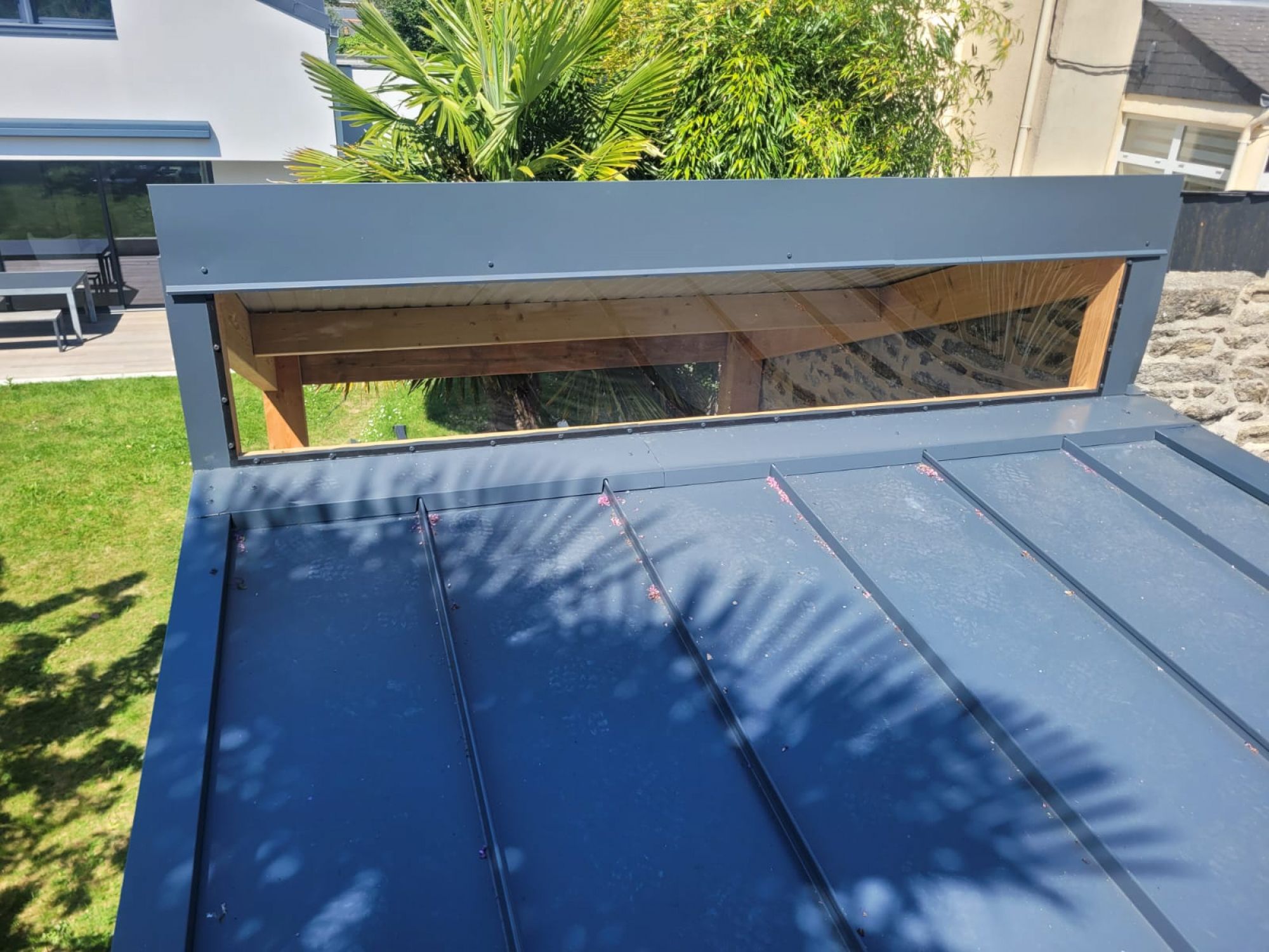 L’originalité du projet repose sur une charpente en bois sur mesure, dont la pente accompagne naturellement l’annexe voisine. Véritable élément architectural, elle structure l’espace tout en laissant entrer la lumière grâce à une fenêtre linéaire discrètement intégrée, apportant une atmosphère douce et lumineuse.